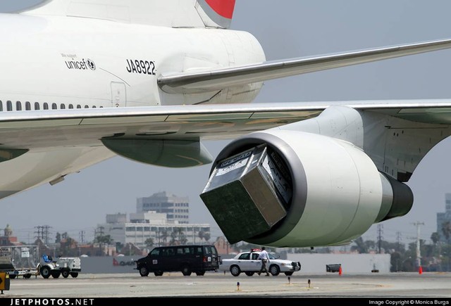 JAL 747 #1 Engine sucked a Luggage Container at LAX.