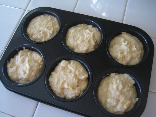 6. 瑪芬烤模底部和圓周先用廚房紙巾薄薄抹上一層油,將麵糊平均舀入。
