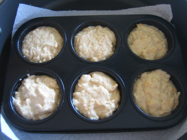 5. 瑪芬烤模底部和圓周先用廚房紙巾薄薄抹上一層油,將麵糊平均舀入。