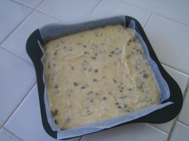 6. 烤模中先鋪好不沾烤紙,將發酵好的麵糰糊填入烤模中,