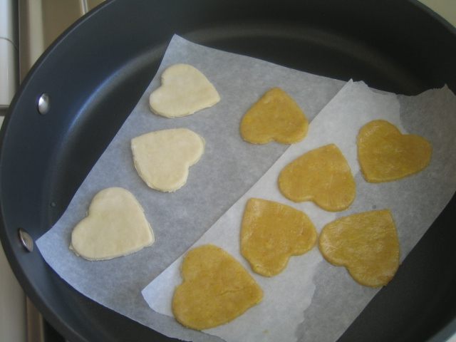 3. 造型薄塔皮和造型酥皮一起放在不沾烤紙上再放入平底鍋烘烤後放涼備用。