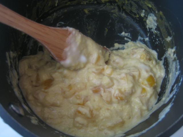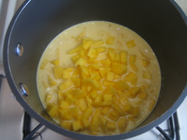 4. 全部倒入小鍋中再加入芒果丁,小火加熱並持續用木匙攪拌。