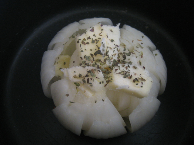 1. 洋蔥放進不沾鍋上面放奶油,再灑上羅勒、蒜粉,蓋上鍋蓋中小火烤 50分鐘。