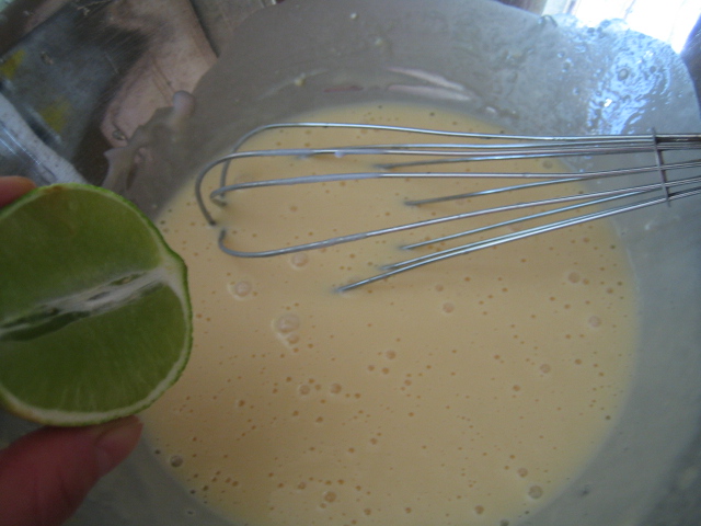 7. 檸檬優格起司糊過篩倒入,再放進平底鍋。