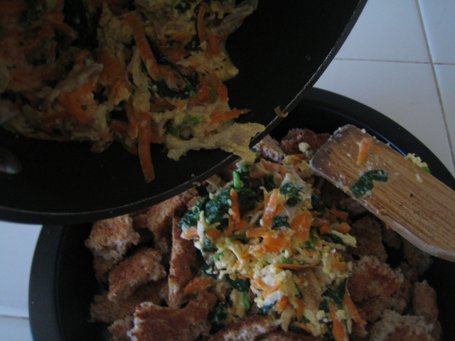 6. 將吐司撕成小碎塊,鋪滿 8 吋圓盤烤模底部。