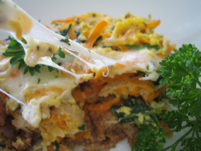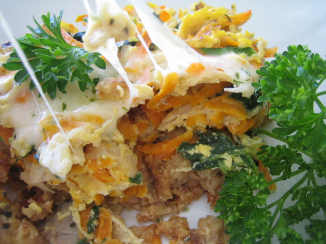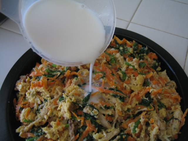 7. 將煮好的雞肉蔬菜倒入鋪平,再倒入剩下的 100 ml 牛奶。