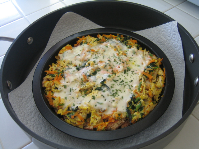 因我使用的是大型有蓋平底鍋,所以我的餡料用烤模來裝。