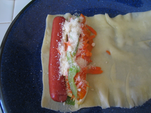 1. 取一片麵皮放上熱狗及適量蔬菜絲,灑一點點 Parmesan 起司粉後捲起來。