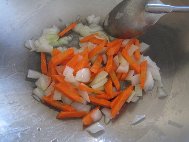 1. 熱油鍋,先爆香洋蔥後,再放胡蘿蔔絲同炒。