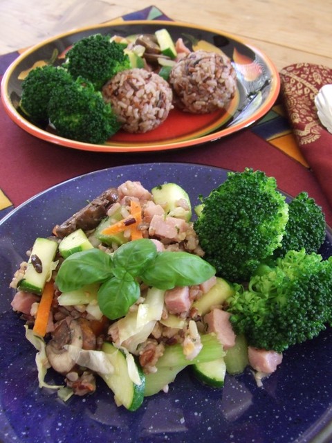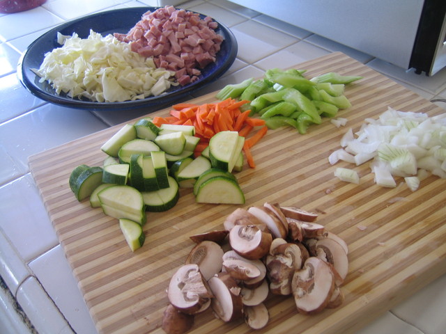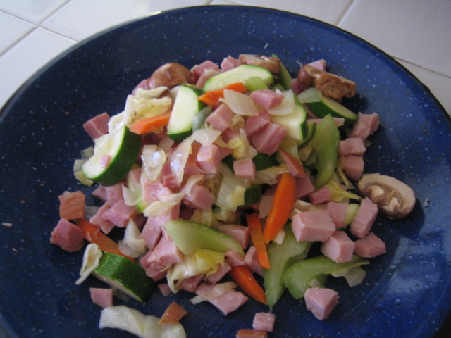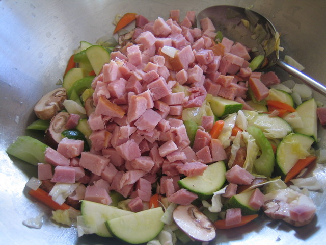 義大利櫛瓜、蘑菇、胡蘿蔔、洋蔥、西洋芹、高麗菜、火腿。