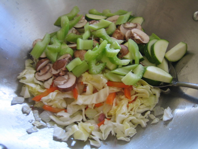 2. 接著放高麗菜,炒到稍軟時放義大利櫛瓜、蘑菇和西洋芹。