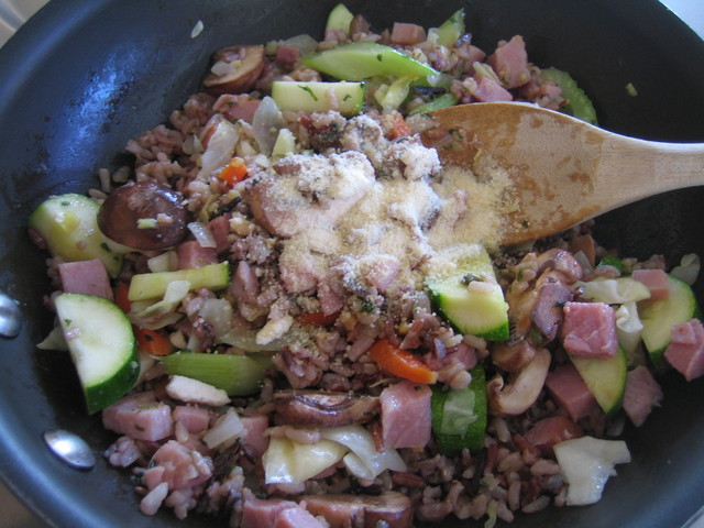 7. 然後再加進一大匙 Parmesan 起司粉快速拌好即可起鍋。