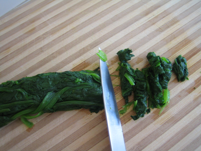 5. 菠菜擰乾,用小刀切成小段。