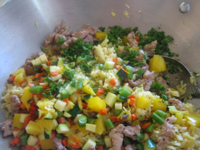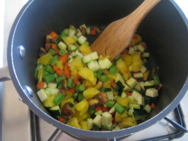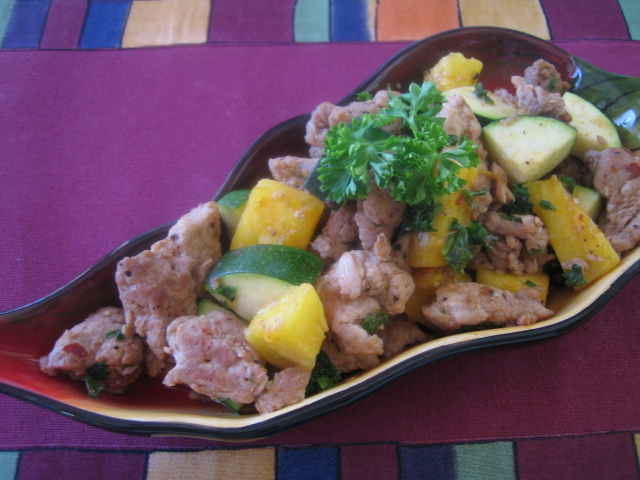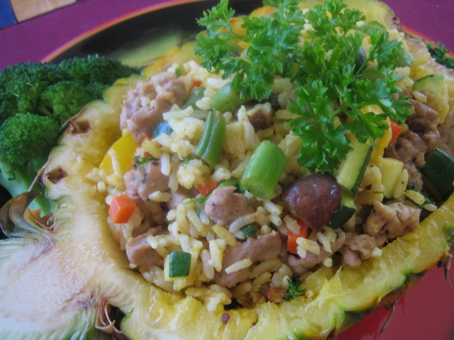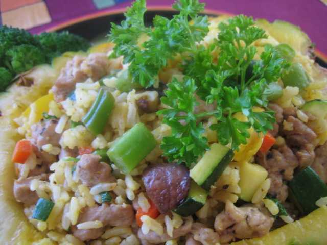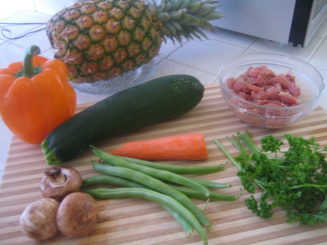 豬排肉、胡蘿蔔、蘑菇、義大利櫛瓜、甜椒、四季豆、Parsley 和鳳梨。