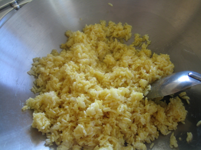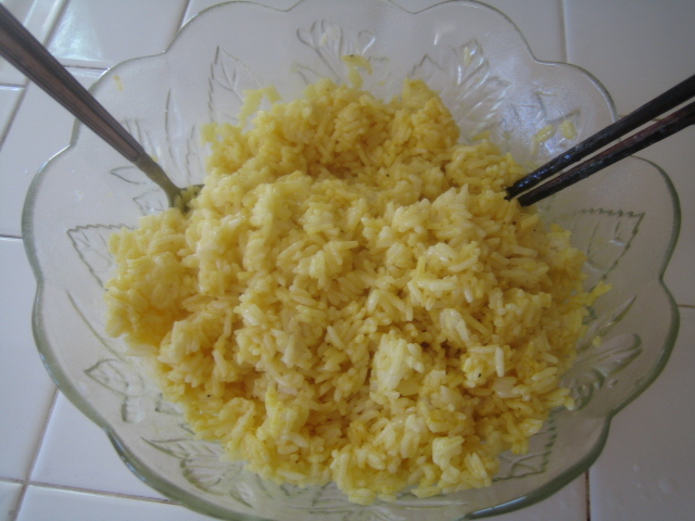 熱鍋放適量油,加入泡過咖哩蛋奶液的米飯迅速翻炒,不要用鍋鏟壓米飯。
