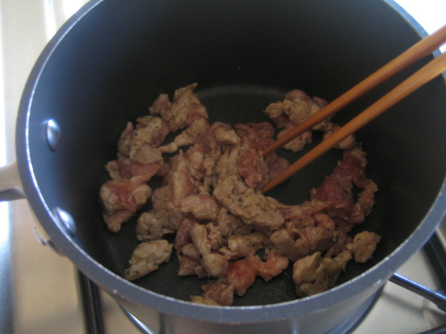 熱一只不沾鍋,不需放油,肉絲先炒至 8 ~ 9 分熟盛起備用。