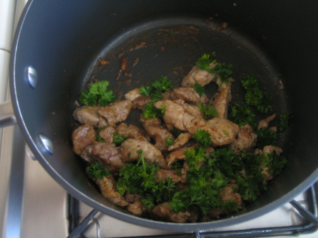 放入肉絲、蔬菜和新鮮 Parsley 碎屑,再加入一些咖哩粉,